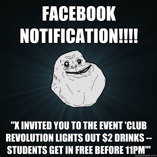 Facebook Notification!!!! "X invited you to the event 'Club Revolution Lights Out $2 drinks --Students get in free before 11pm'"