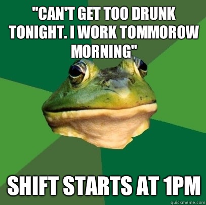 "Can't get too drunk tonight. I work Tommorow morning" Shift starts at 1PM