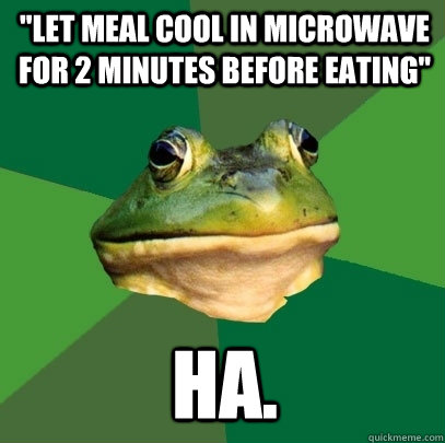 "Let meal cool in microwave for 2 minutes before eating" Ha.