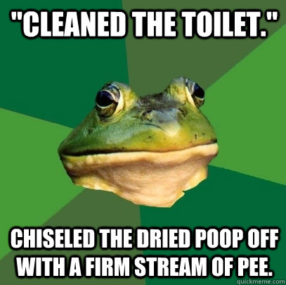 "Cleaned the toilet." Chiseled the dried poop off with a firm stream of pee.