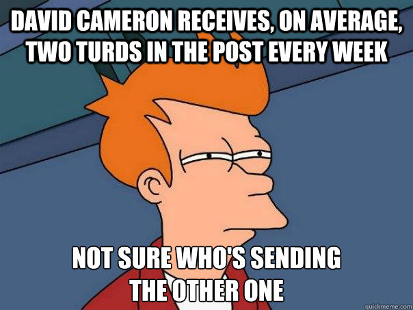 david cameron receives, on average, two turds in the post every week not sure who's sending the other one