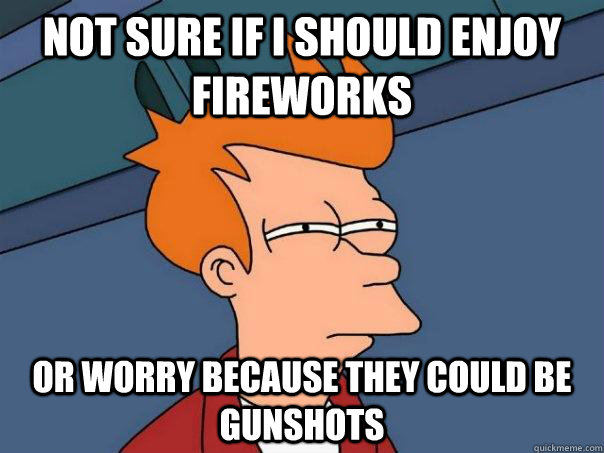 Not sure if i should enjoy fireworks Or worry because they could be gunshots