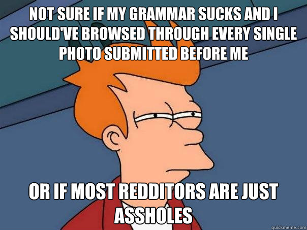 Not sure if my grammar sucks and i should've browsed through every single photo submitted before me Or if most redditors are just assholes