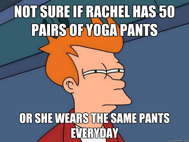 Not sure if Rachel has 50 pairs of yoga pants Or she wears the same pants everyday