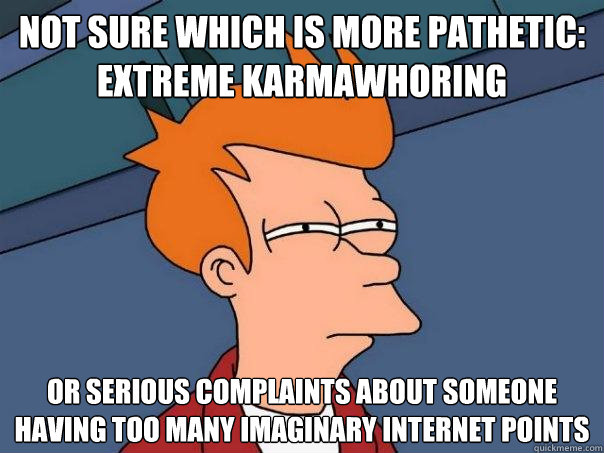 Not sure which is more pathetic: extreme karmawhoring Or serious complaints about someone having too many imaginary internet points