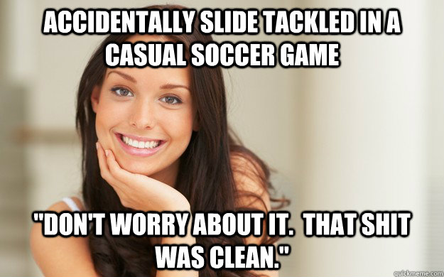 Accidentally slide tackled in a casual soccer game "Don't worry about it. That shit was clean."