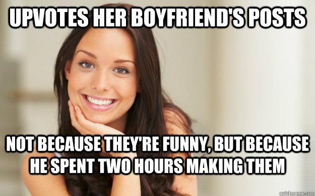 Upvotes her boyfriend's posts not because they're funny, but because he spent two hours making them