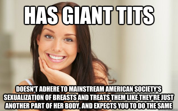 has giant tits doesn't adhere to mainstream american society's sexualization of breasts and treats them like they're just another part of her body, and expects you to do the same