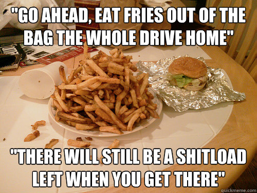 "Go ahead, eat fries out of the bag the whole drive home" "There will still be a shitload left when you get there"