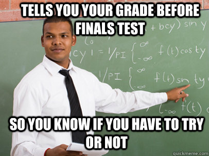 TELLS YOU YOUR GRADE BEFORE FINALS TEST SO YOU KNOW IF YOU HAVE TO TRY OR NOT