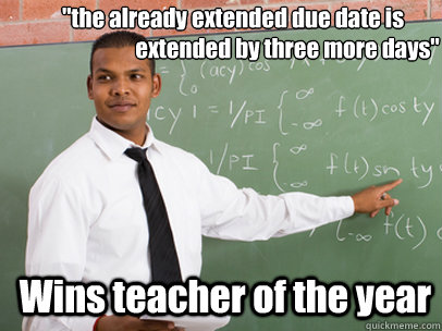 "the already extended due date is extended by three more days" Wins teacher of the year