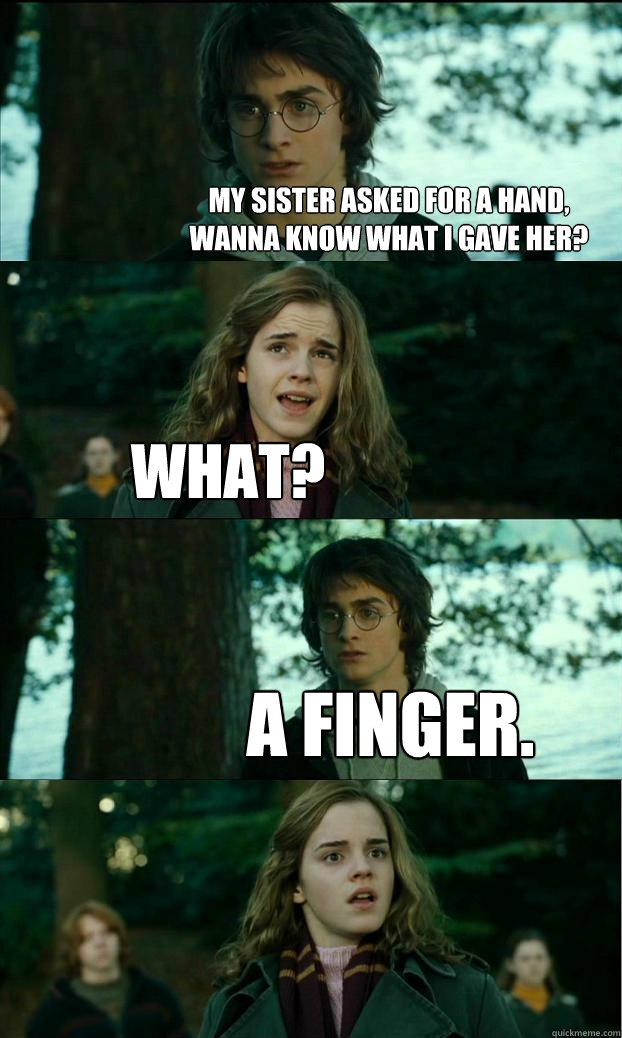 My sister asked for a hand, wanna know what I gave her? What? A finger.