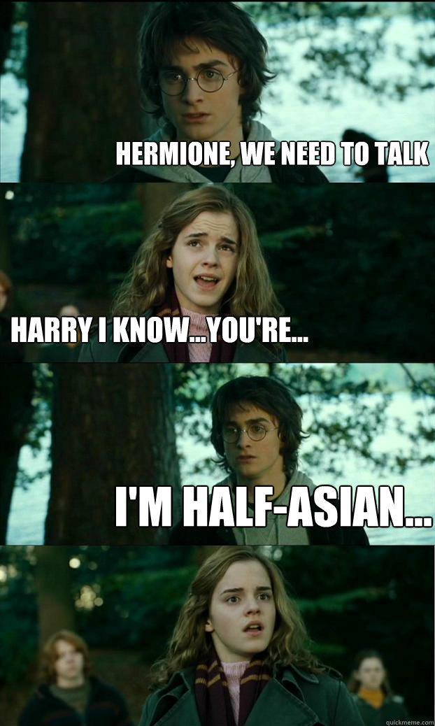 Hermione, we need to talk Harry I know...you're... I'm half-asian...