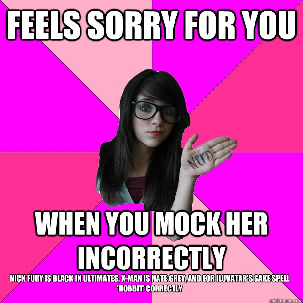 feels sorry for you When you mock her incorrectly Nick Fury is black in ultimates, X-man is nate grey, and for iluvatar's sake spell 'hobbit' correctly