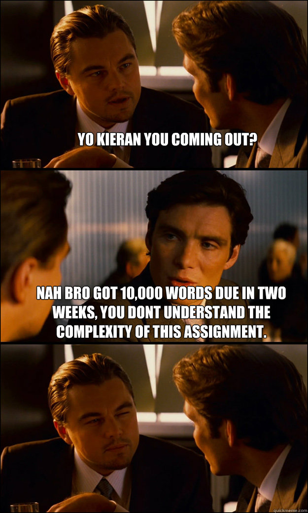 Yo kieran you coming out? Nah bro got 10,000 words due in two weeks, you dont understand the complexity of this assignment.