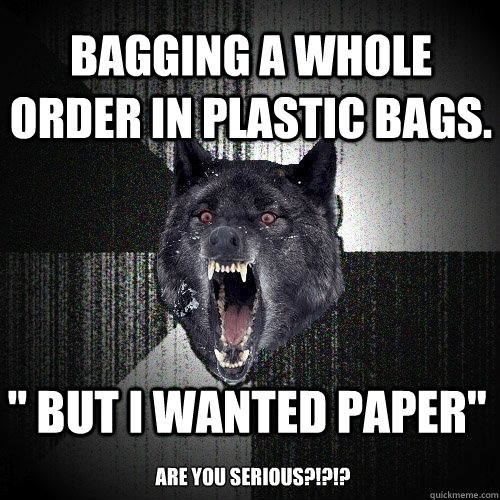 bagging a whole order in plastic bags. " but i wanted paper" are you serious?!?!?