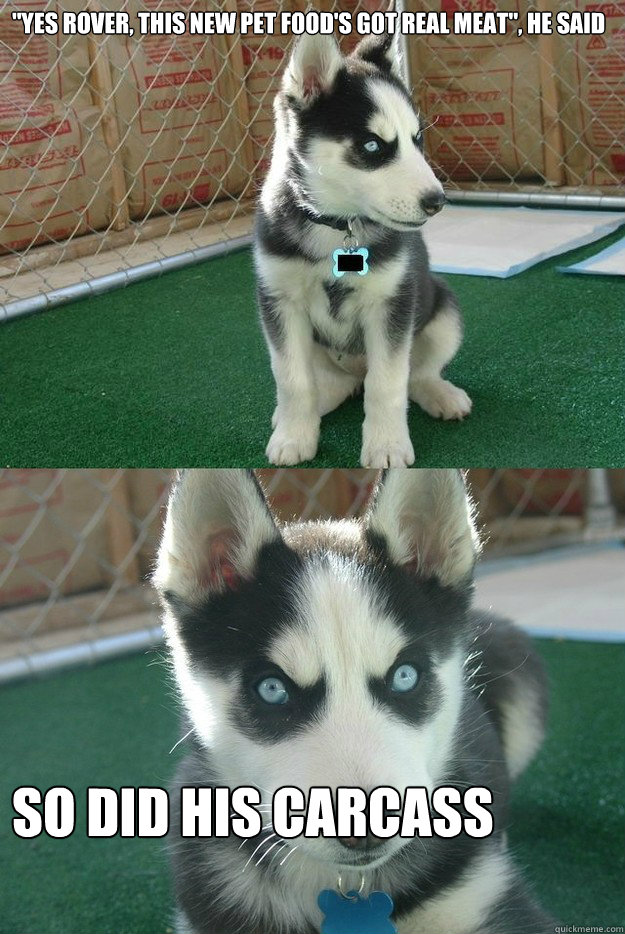 "yes rover, this new pet food's got real meat", he said so did his carcass