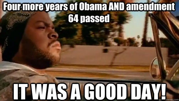 Four more years of Obama AND amendment 64 passed IT WAS A GOOD DAY!
