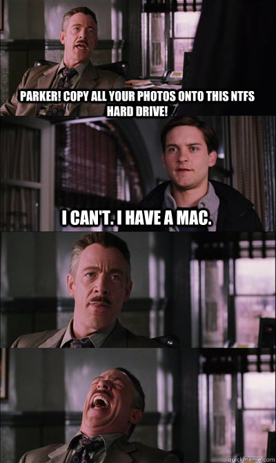 Parker! Copy all your photos onto this NTFS hard drive! I can't. I have a Mac.