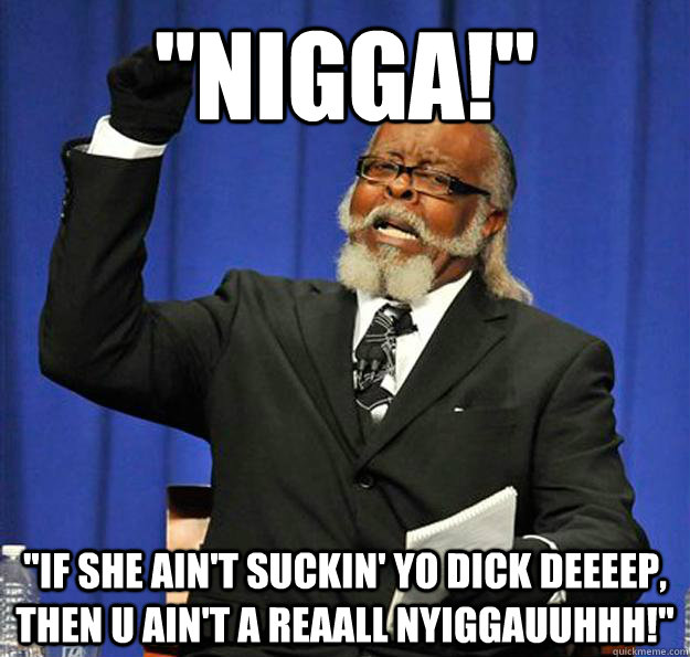 "nigga!" "if she ain't suckin' yo dick deeeep, then u ain't a reaall nyiggauuhhh!"