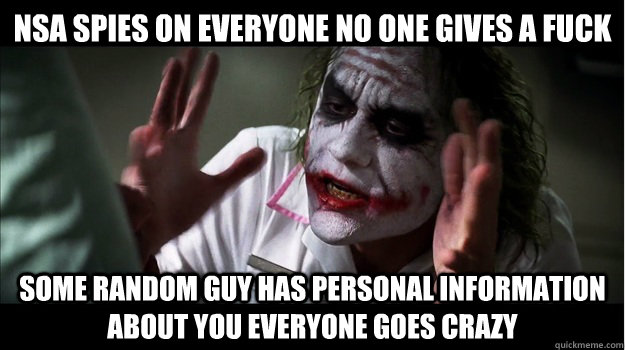 NSA spies on everyone no one gives a fuck Some Random Guy has Personal information about you everyone goes crazy