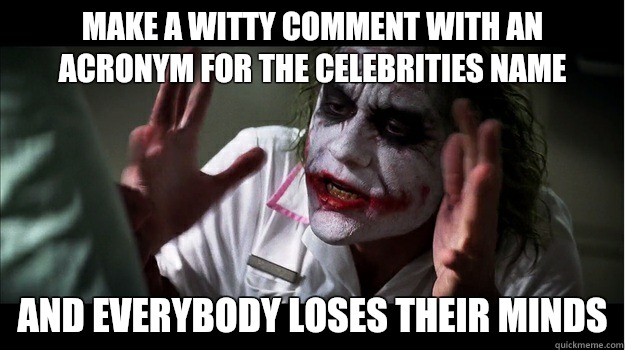 Make a witty comment with an acronym for the celebrities name AND EVERYBODY LOSES their minds