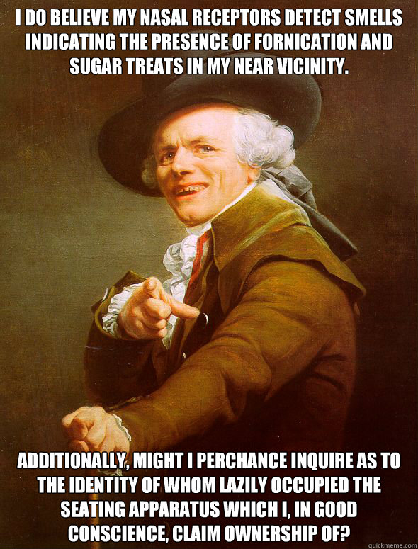 I do believe my nasal receptors detect smells indicating the presence of fornication and sugar treats in my near vicinity. Additionally, might I perchance inquire as to the identity of whom lazily occupied the seating apparatus which I, in good conscience