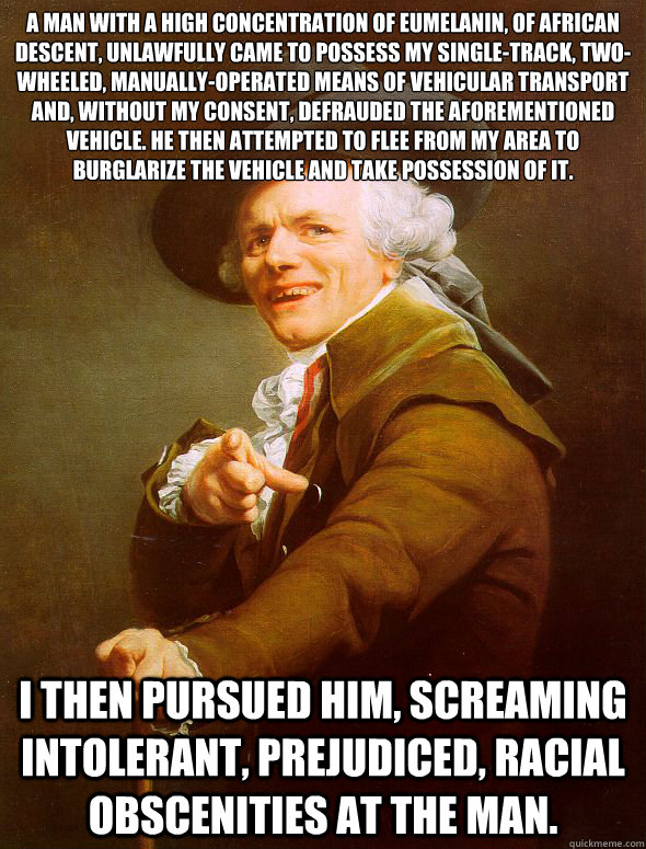 A man with a high concentration of eumelanin, of African descent, unlawfully came to possess my single-track, two- wheeled, manually-operated means of vehicular transport and, without my consent, defrauded the aforementioned vehicle. He th