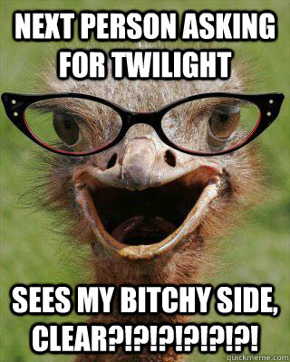 Next person asking for twilight sees my bitchy side, clear?!?!?!?!?!?!