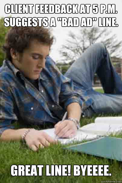 CLIENT feedback at 5 p.m. suggests a "BAD AD" line. GREAT LINE! BYEEEE.