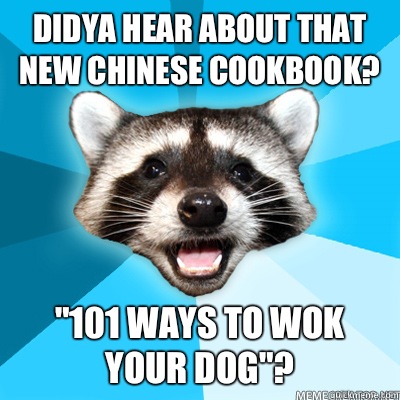 Didya hear about that new Chinese cookbook? "101 Ways to Wok your Dog"?