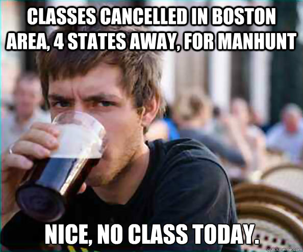 Classes cancelled in Boston Area, 4 states away, for manhunt Nice, no class today.