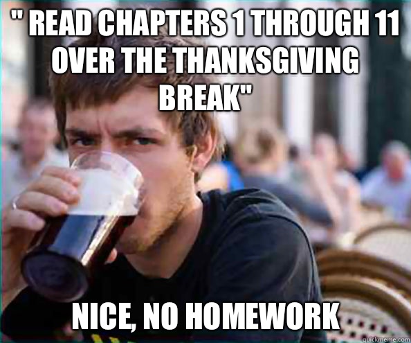 " read chapters 1 through 11 over the thanksgiving break" Nice, no homework
