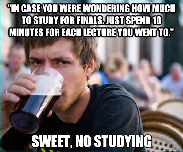 "In case you were wondering how much to study for finals. Just spend 10 minutes for each lecture you went to." Sweet, no studying
