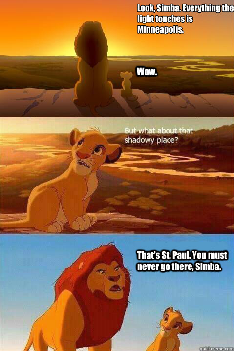 Look, Simba. Everything the light touches is Minneapolis. Wow. That's St. Paul. You must never go there, Simba.