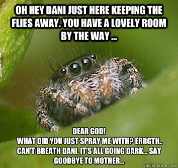 Oh hey dani just here keeping the flies away. you have a lovely room by the way ... dear god! What did you just spray me with? errgth.. can't breath dani, it's all going dark... say goodbye to mother...