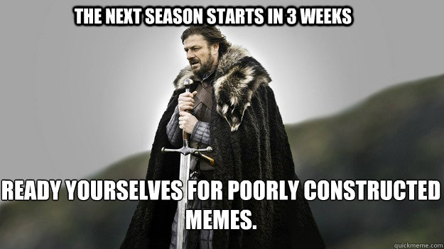 The next season starts in 3 weeks Ready yourselves for poorly constructed memes.