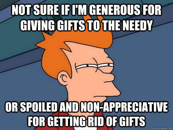 Not sure if i'm generous for giving gifts to the needy or spoiled and non-appreciative for getting rid of gifts