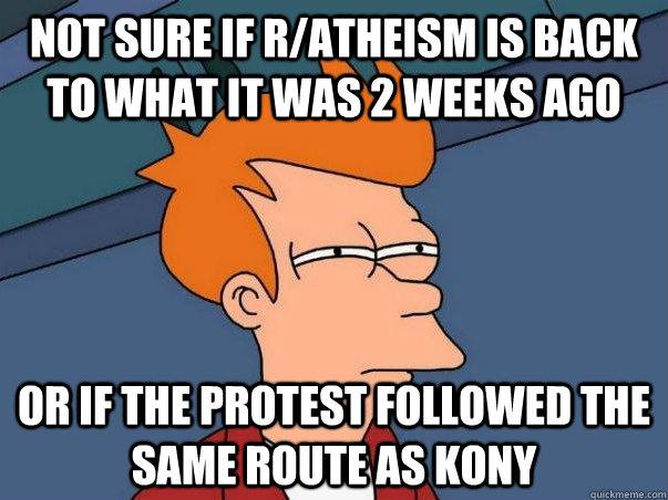 Not sure if r/atheism is back to what it was 2 weeks ago or If the protest followed the same route as Kony