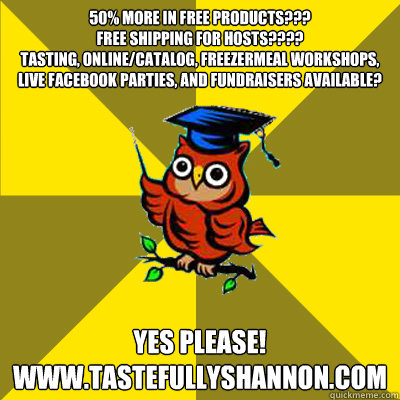 50% More in free products??? Free Shipping for Hosts???? Tasting, Online/Catalog, FreezerMeal Workshops, Live Facebook Parties, and FUNdraisers Available? YES PLEASE! www.tastefullyshannon.com