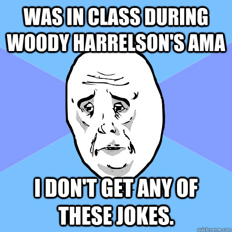 Was in class during Woody Harrelson's AMA I don't get any of these jokes.