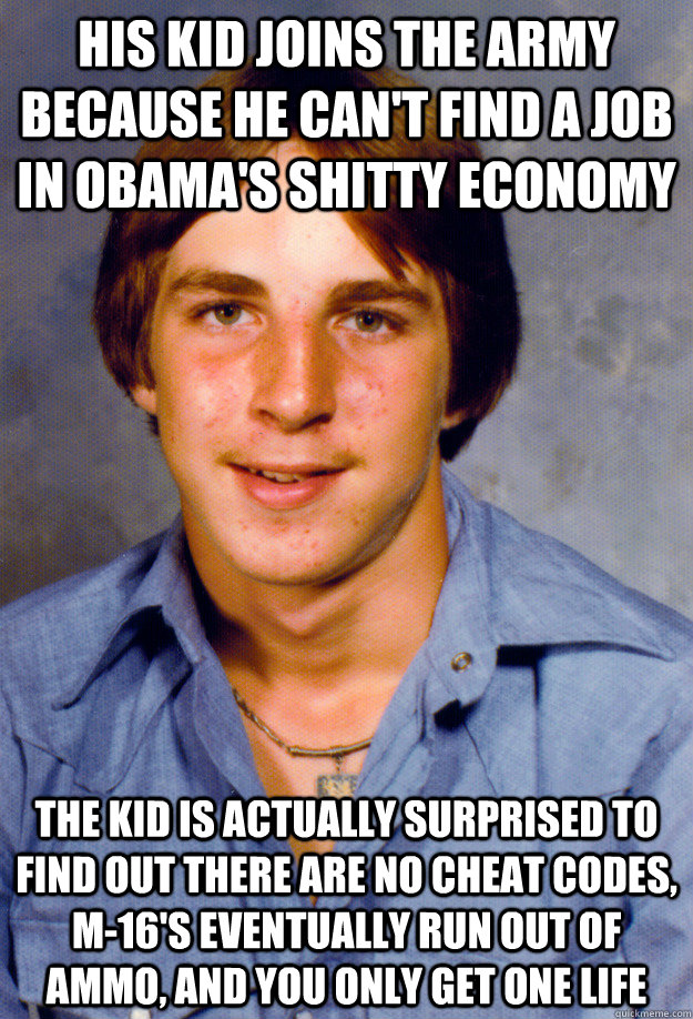 HIS KID JOINS THE ARMY BECAUSE HE CAN'T FIND A JOB IN OBAMA'S SHITTY ECONOMY THE KID IS ACTUALLY SURPRISED TO FIND OUT THERE ARE NO CHEAT CODES, M-16'S EVENTUALLY RUN OUT OF AMMO, AND YOU ONLY GET ONE LIFE