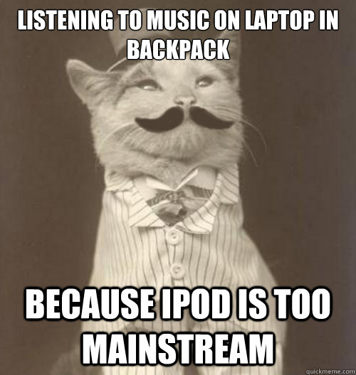 listening to music on laptop in backpack because Ipod is too mainstream