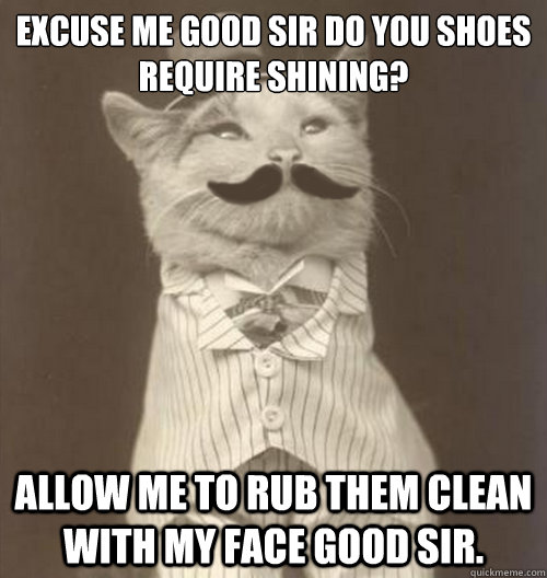 excuse me good sir do you shoes require shining? Allow me to rub them clean with my face good sir.