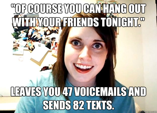 "Of course you can hang out with your friends tonight." Leaves you 47 voicemails and sends 82 texts.