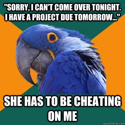 "Sorry, I can't come over tonight. I have a project due tomorrow..." she has to be cheating on me