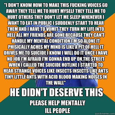 "i don't know how to make this fucking voices go away they tell me to hurt myself they tell me to hurt others they don't let me sleep whenever i want to eat in public i suddenly start to hear them and i have to vomit they turn my life into hell all my fri