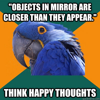 "Objects in mirror are closer than they appear." THINK HAPPY THOUGHTS