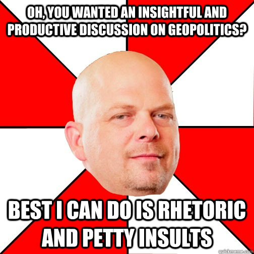 Oh, you wanted an insightful and productive discussion on geopolitics? Best I can do is rhetoric and petty insults