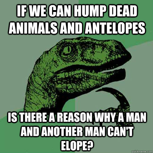 If we can hump dead animals and antelopes Is there a reason why a man and another man can't elope?